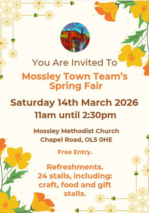 Saturday 14th March is the date for Mossley Town Team's Spring Fair. It takes place at Mossley Methodist Church, Chapel Road, Mossley between 11am and 2.30pm.