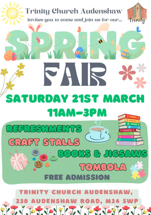 Trinity Church Audenshaw's Spring Fair is on Saturday 21st March, 11am–3pm at Trinity Church, Audenshaw Road
