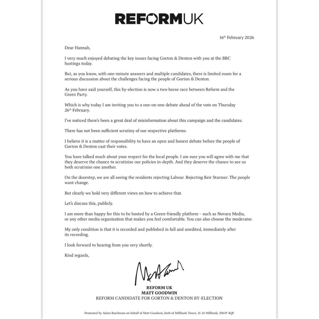 Reforms Matt Goodwin challenges Green’s Hannah Spencer to debate
