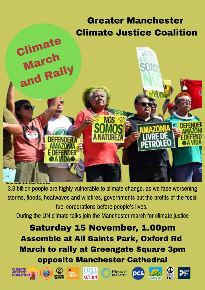 Tomorrow (Saturday 15th Nov) is the middle weekend of COP30, and there will be actions across the world calling for 'Climate Justice' - local campaigners will be joining a march and rally in Manchester.